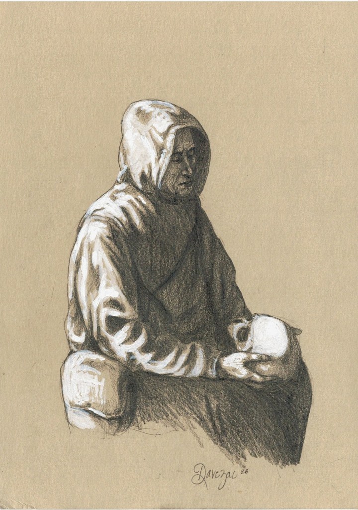 Figure à la vanité, 2026, crayon & gouache sur kraft, A5